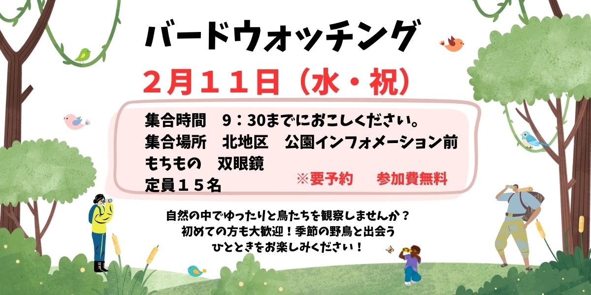 ※要予約【時間】9:30集合【集合場所】北地区 公園インフォメーション【参加費】無料【定員】15名【持ち物】双眼鏡【予約受付】管理事務所TEL 072-992-2489
