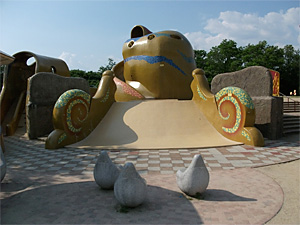 カタツムリをモチーフにした大型遊具のある広場です。巻き貝の中の螺旋状の階段や、滑り台で遊べます。砂場の周りの壁ではウォールクライミングも楽しめます。