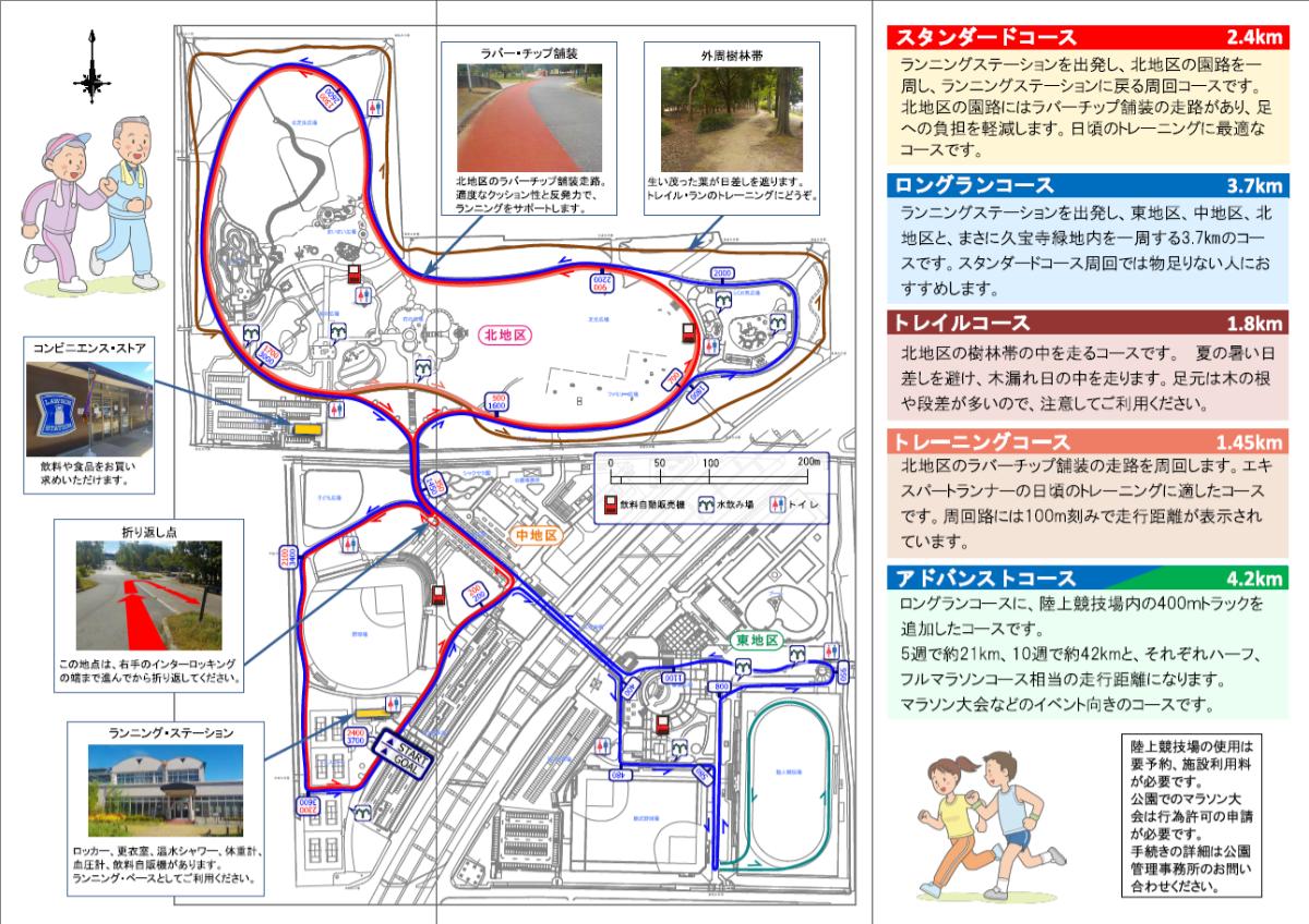 - ランニングステーションを出発し、北地区の園路を一周し、ランニングステーションに戻る周回コースです。北地区の園路にはラバーチップ舗装の走路があり、足への負担を軽減します。日頃のトレーニングに最適なコースです。