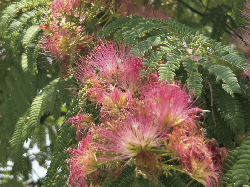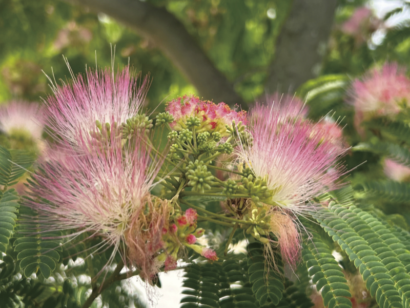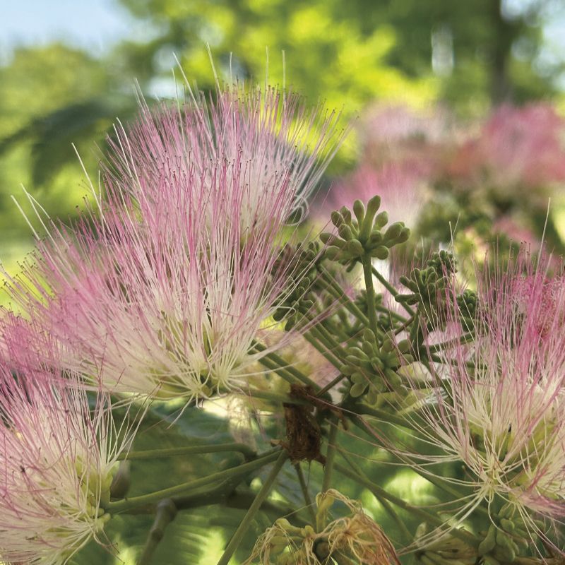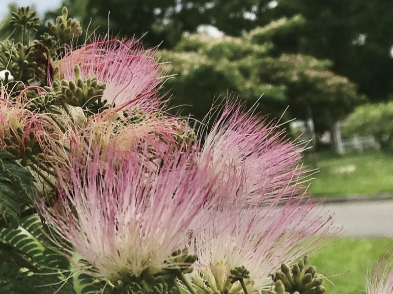日本原産で、丈夫でよく育つことから、公園や神社など、庭木にもよく利用されます。花は日中の暑さが和らぎ、涼しくなった夕暮れ時に咲き始めます。化粧用の刷毛のような、ふんわりとした不思議な形の花を咲かせます。花のほとんどはおしべの花糸(かし)で、毛先がピンク色をしています。ピンクのおしべより、長い白色の糸状のものがめしべです。甘い香りに誘われて夜にはスズメガがやってきて、受粉を手伝ってくれます。