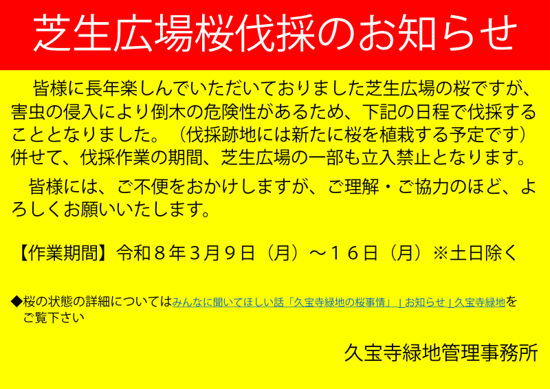 皆様に長年楽しんでいただいておりました芝生広場の桜ですが、害虫の侵入により倒木の危険性があるため、下記の日程で採することとなりました。(伐採跡地には新たに桜を植栽する予定です)併せて、伐採作業の期間、芝生広場の一部も立入禁止となります。