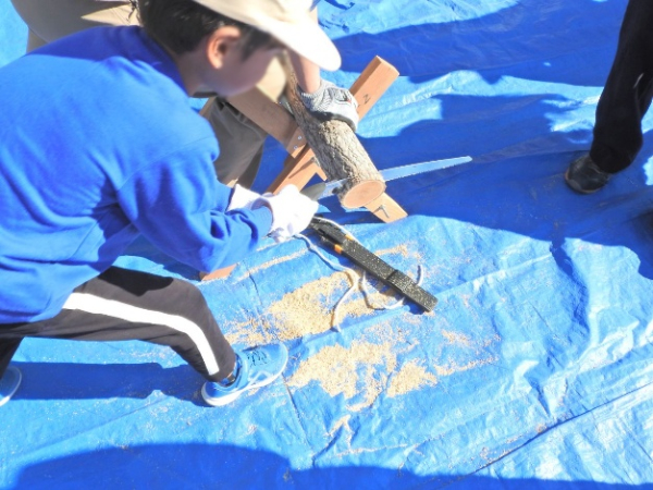 先生に、のこぎりの使い方と注意を教えていただいてから、丸太切りに挑戦です。